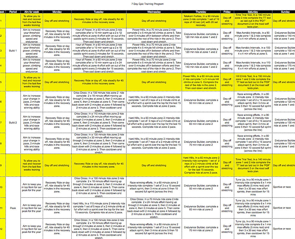 Choice of training but be mindful of tomorrow’s session. 1 hour ride, in the PLAN WEEKS 1-4. WEEK/DAY MONDAY TUESDAY WEDNESDAY THURSDAY FRIDAY SATURDAY SUNDAY WEEK 5 WEEK 6 sportive. Stay in upper Zone 1 on flats and Zone 2 on hills. Endurance ride of ... Fetch Doc