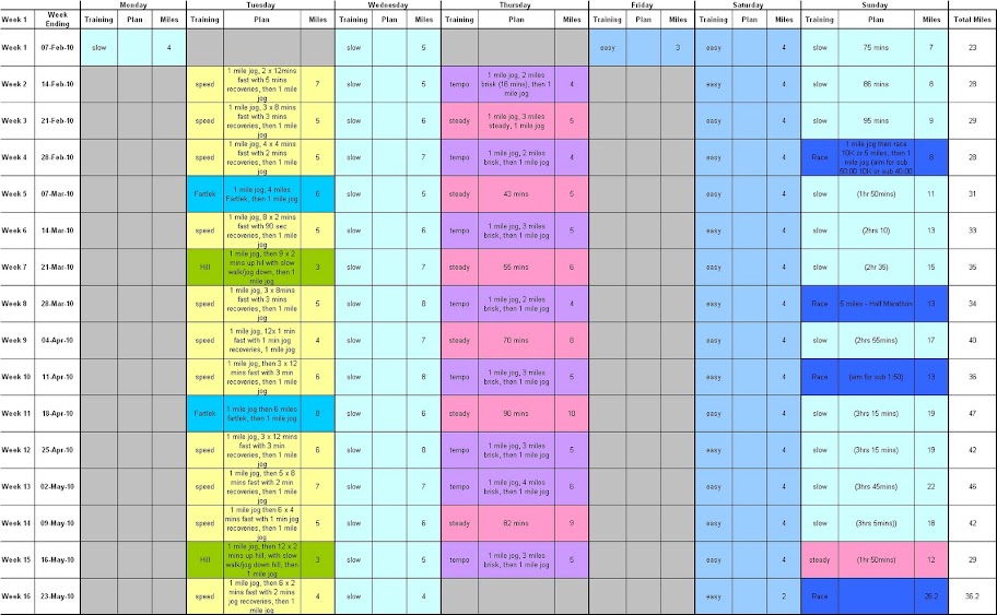 This beginner marathon training program assumes you have been running consistently for schedule. 16-Week Marathon Training Schedule Week Mon Tue Wed Thu Fri Sat Sun Total 1 3 Rest 4 3 Rest 5 Rest 15 2 3 Rest 4 3 Rest 6 Rest 16 3 3 Rest 4 3 Rest 7 Rest 17 4 3 Rest 5 3 Rest 8 Rest 19 ... Retrieve Full Source